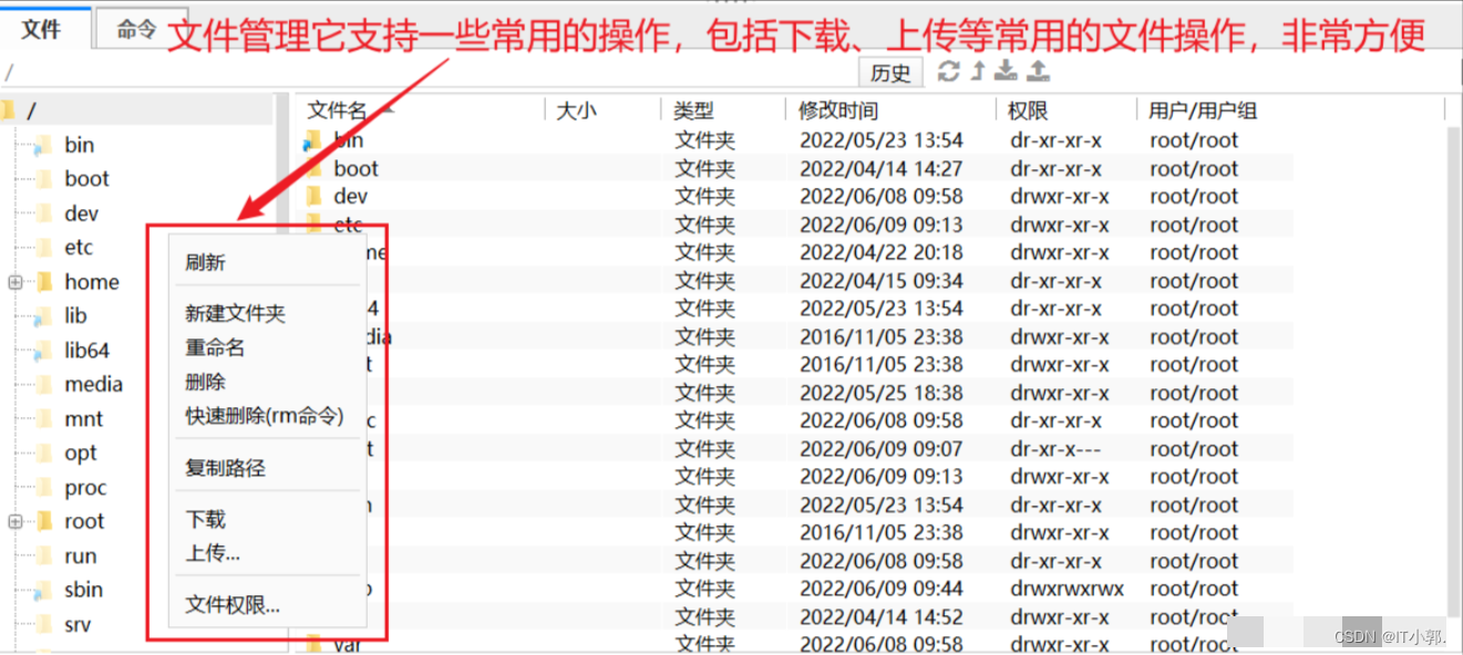 文件列表:左边是树型目录,也就是服务器上所有的目录,右边是对应目录的详细内容。 在这里可以方便的操纵文件举行上传下载删除以及赋权等等。