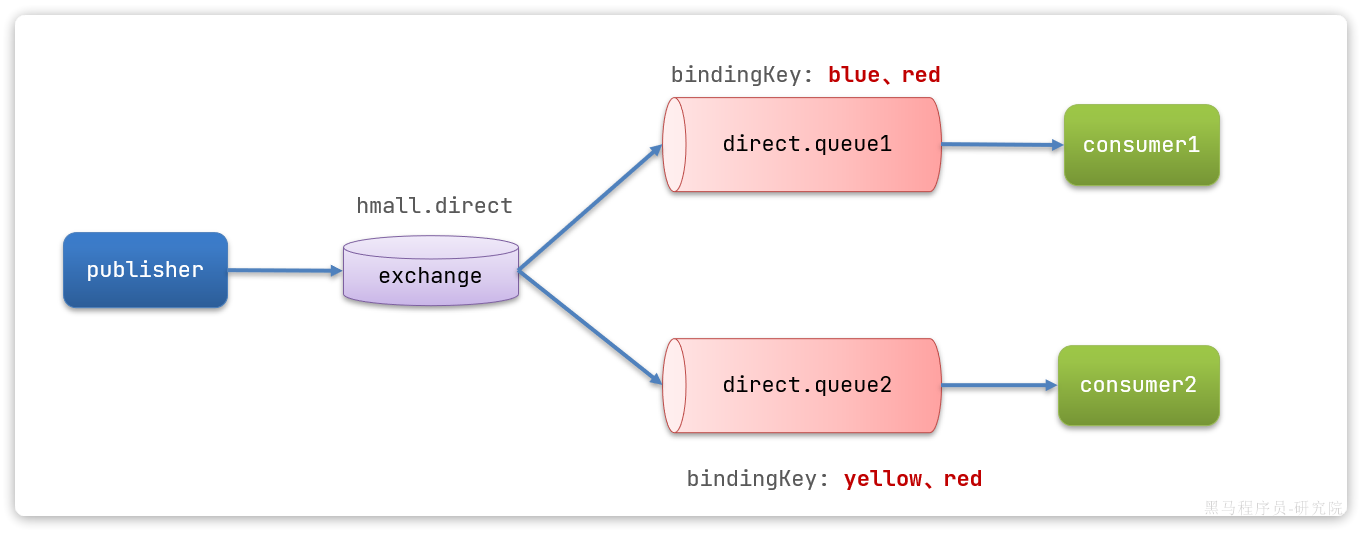 - 声明队列direct.queue2,绑定hmall.direct,bindingKey为yellow和red