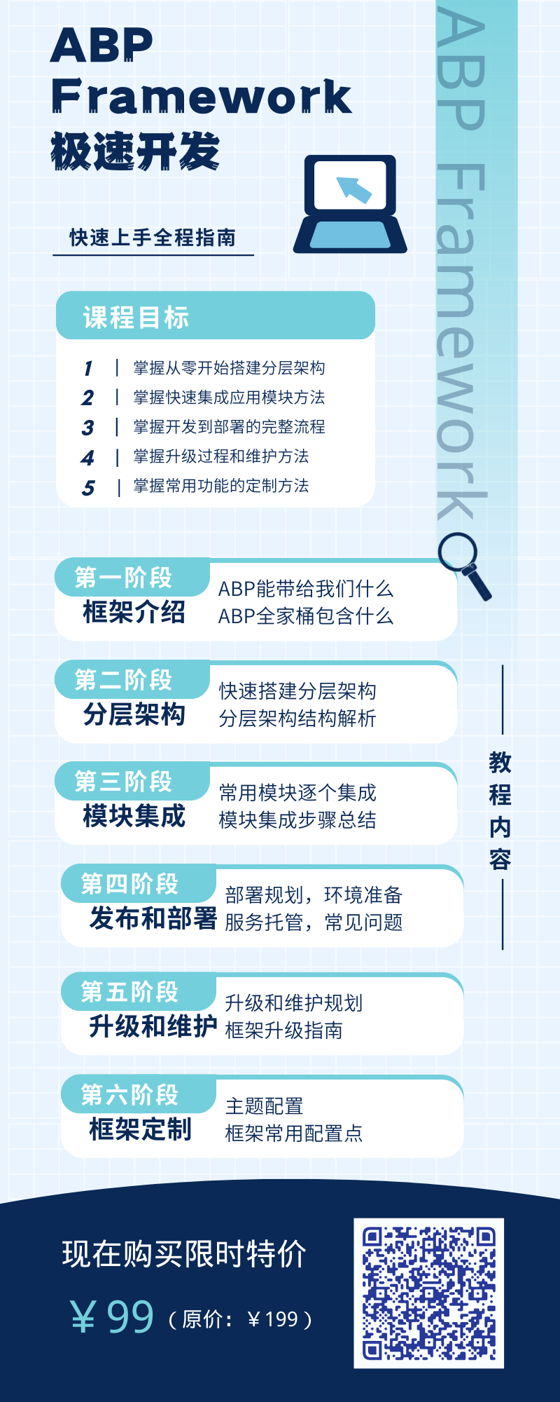 本教程旨在帮助快速应用和整合 ABP Framework “全家桶”,快速集成常用应用模块,充分发挥