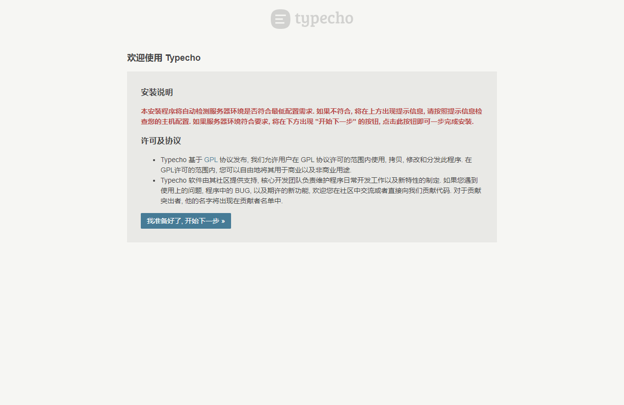 下载源代码- wget https://github.com/typecho/typecho/releases/latest/download/typecho.zip