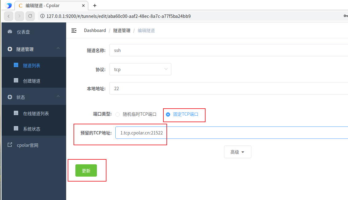 修改隧道信息,将保存乐成的固定tcp地址配置到隧道中
