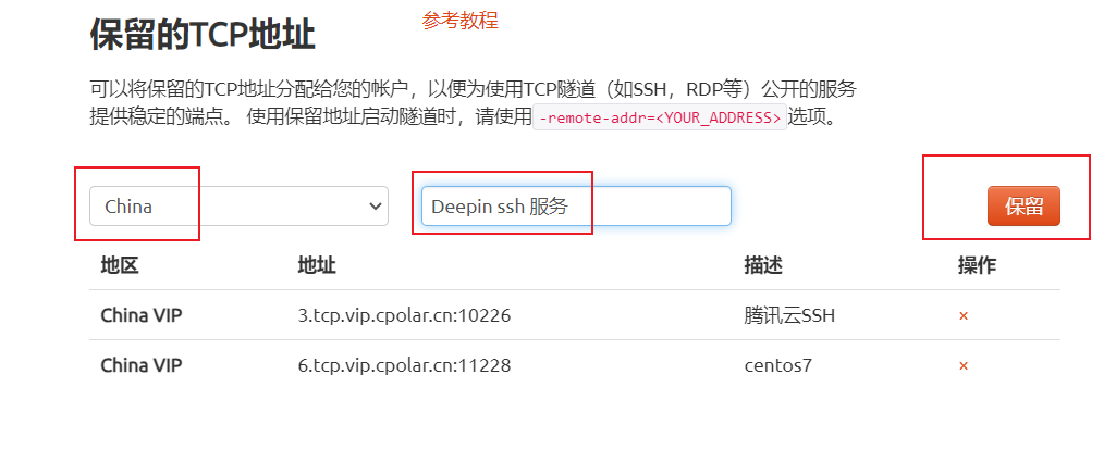 登录cpolar官网,点击左侧的预留,找到保存的tcp地址,我们来为SSH保存一个固定tcp地址: