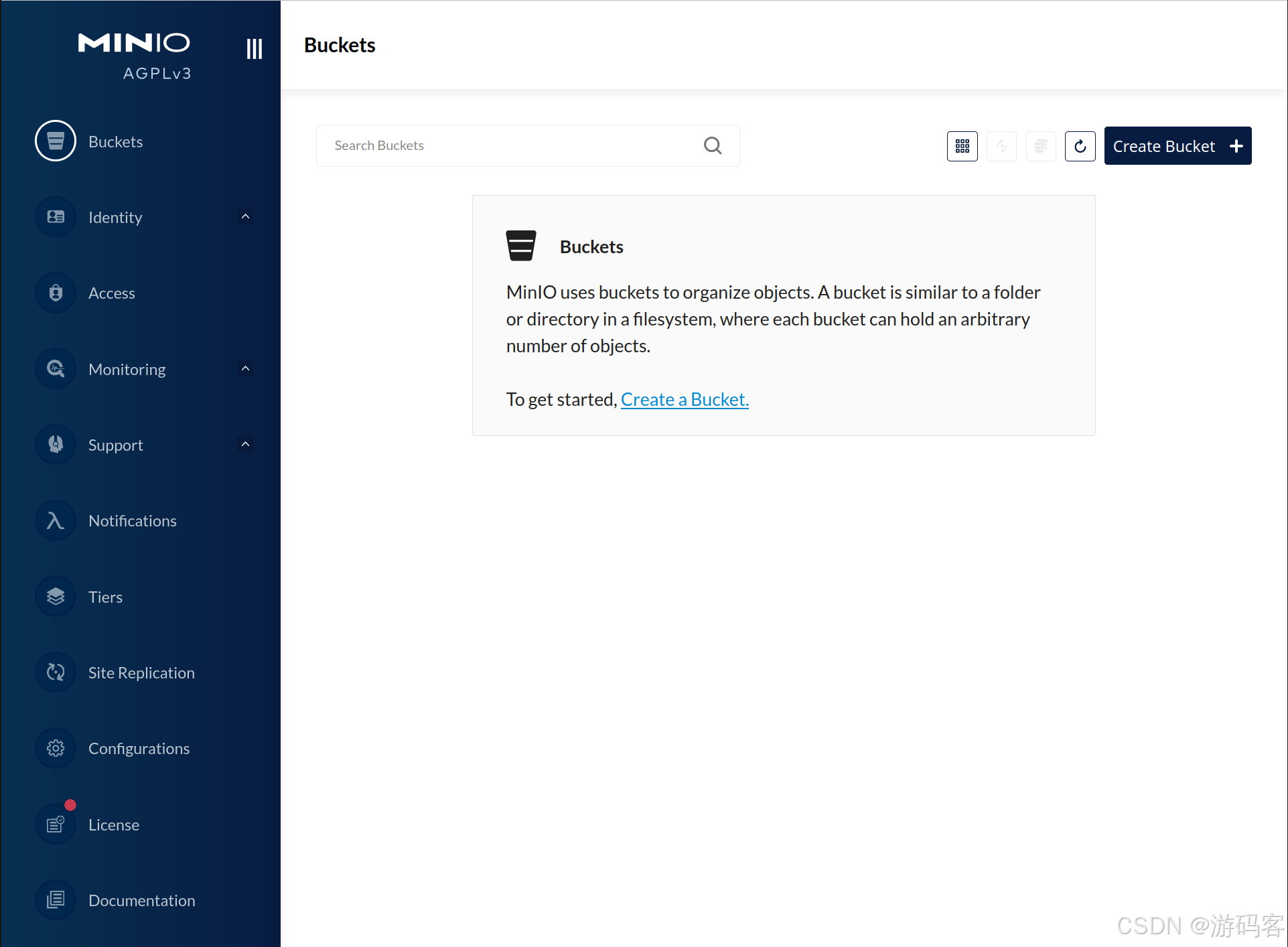 登录到 MinIO 控制台后,您可以创建存储桶、上传文件、管理用户和计谋等。