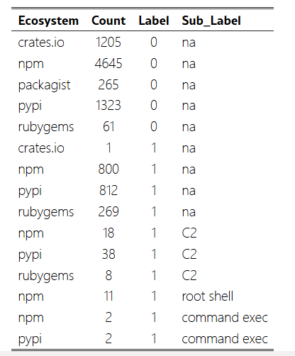 OSPTrack数据集包含9461个包陈诉(此中1962个为恶意),涵盖了npm、pypi、crates.io、nuget和packagist等多个生态系统。数据集包含了详细的子标签,用于攻击类型的验证信息,有助于在源代码访问受限的情况下识别恶意指标,并支持在运行时进行有效的检测方法。