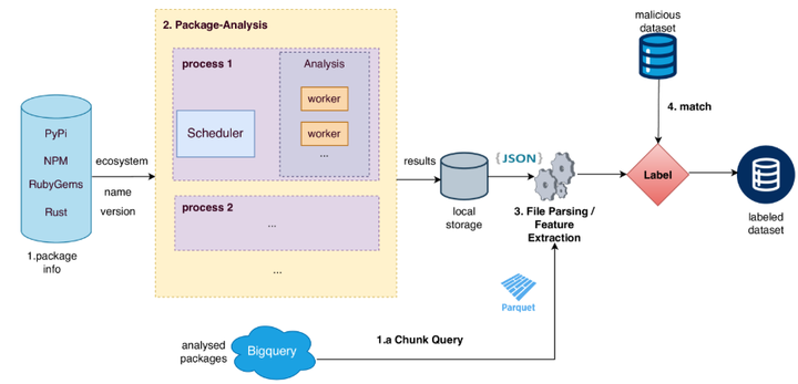 数据集的构建采用了多进程分析包、陈诉解析与特征提取、终极标签匹配的方法。部门数据来自现有的BigQuery数据集,该数据集由package-analysis工具生成,包含静态和动态特征。