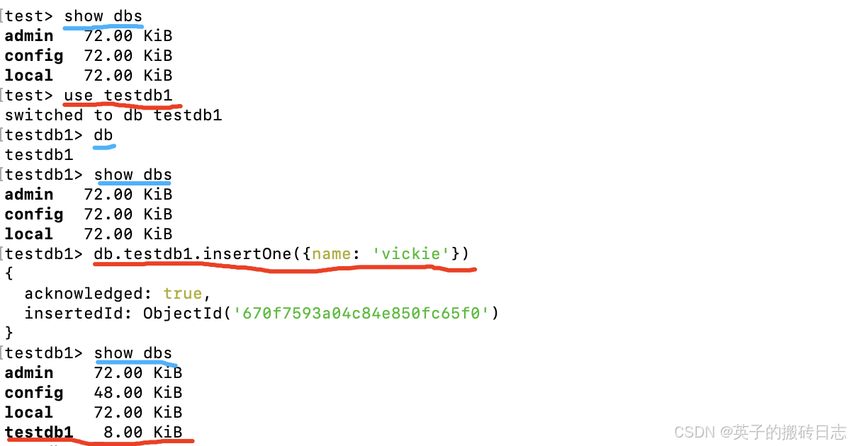 - 插入文档:db.<collection_name>.insertOne({ ... })