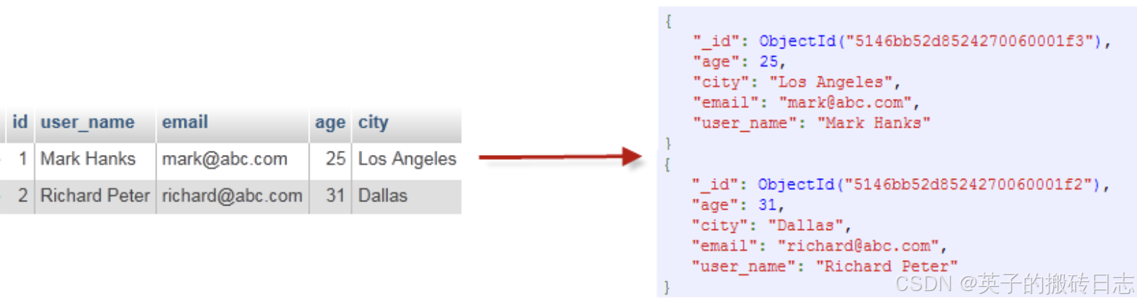 SQL 术语/概念MongoDB 术语/概念表明/阐明databasedatabase数据库tablecollection表 , 集合rowdocument行 ,文档columnfield列,字段 / 域indexindex索引table joins\表连接,MongoDB不支持primary keyprimary key主键,MongoDB主动将key为_id的字段设置为主键 举例对比如下: