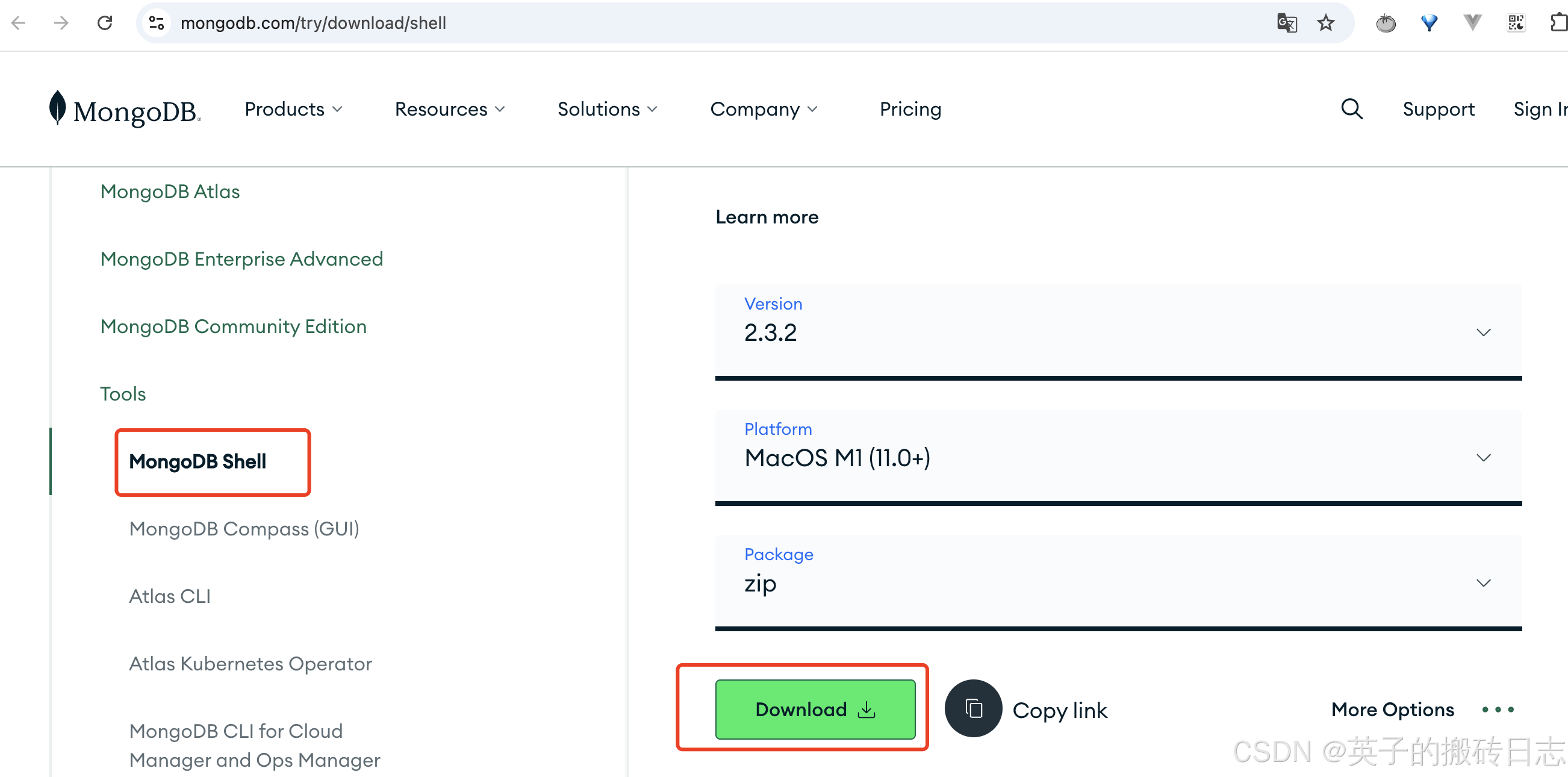 安装MogoDB Shell,下载地点:https://www.mongodb.com/try/download/shell