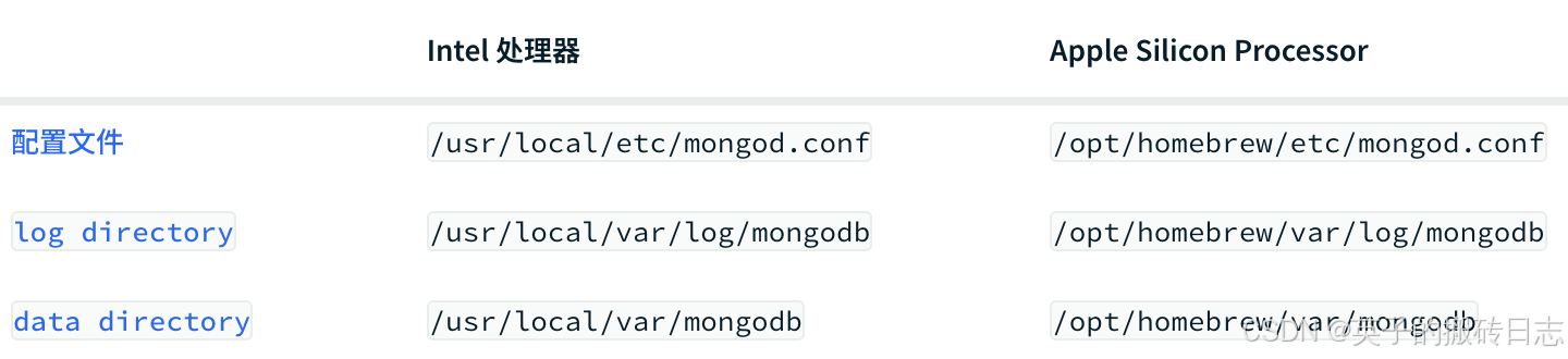 根据差别mac处理器,mongodb安装过程中会在差别的位置创建对应文件和目次: