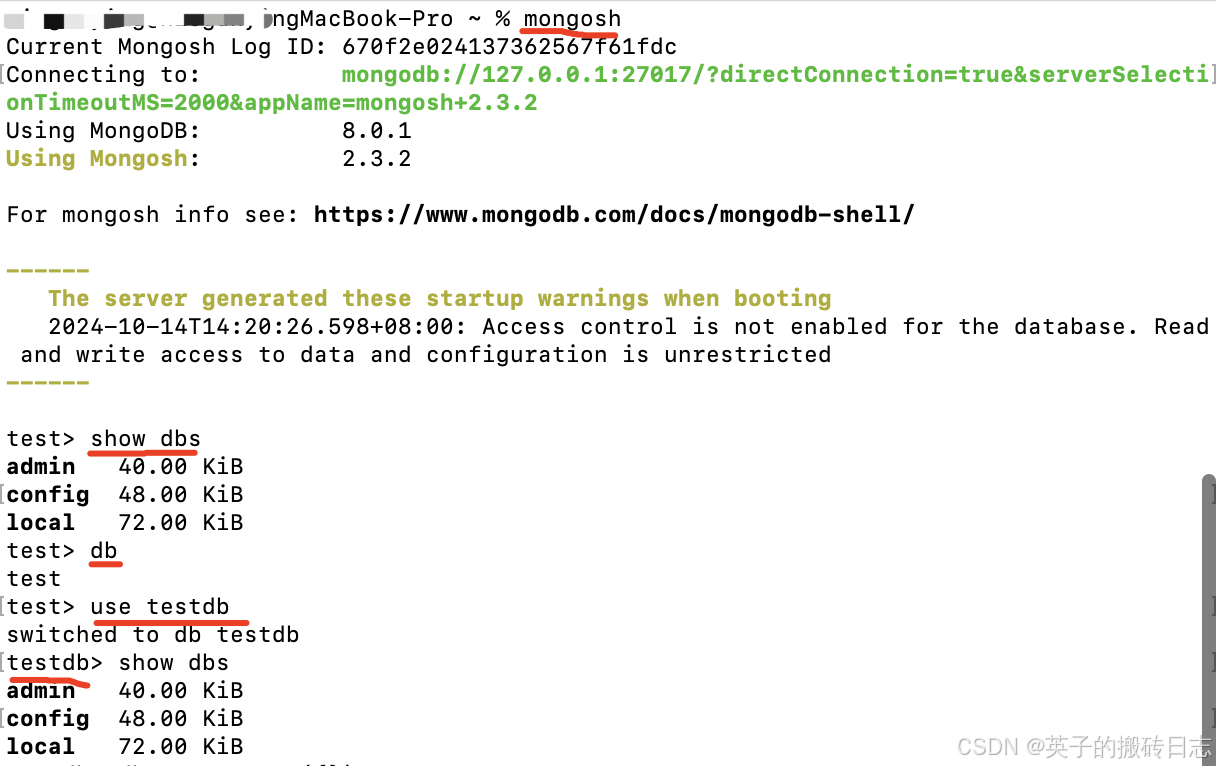 - mongosh // 启动MongoDB Shell,如果MongoDB服务器运行在本地默认端口(27017),则可以直接连接