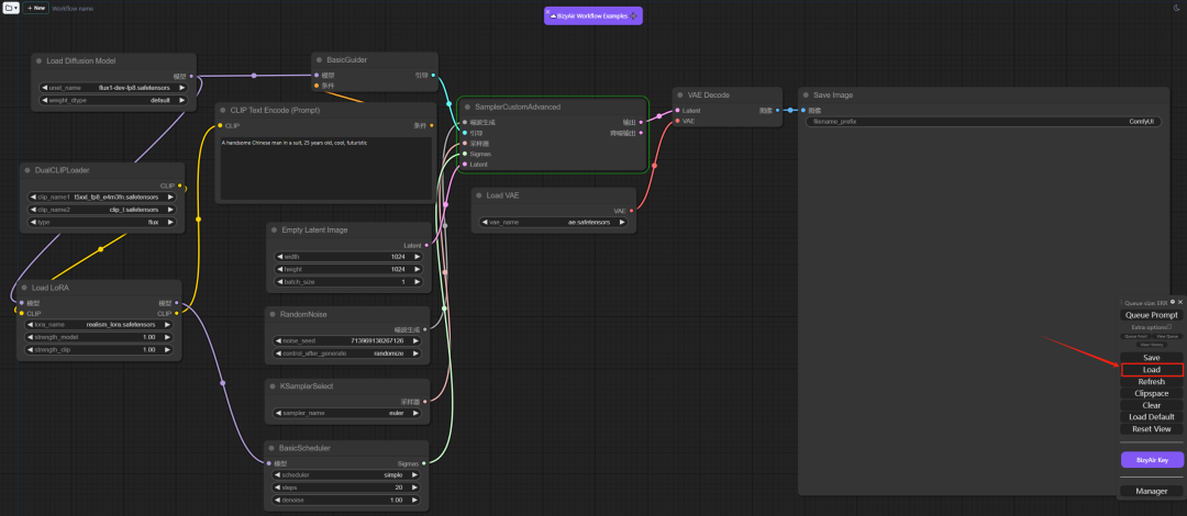 点击ComfyUI启动脚本文件, 在主界面点击"load" 按钮,把工作流文件加载进来。