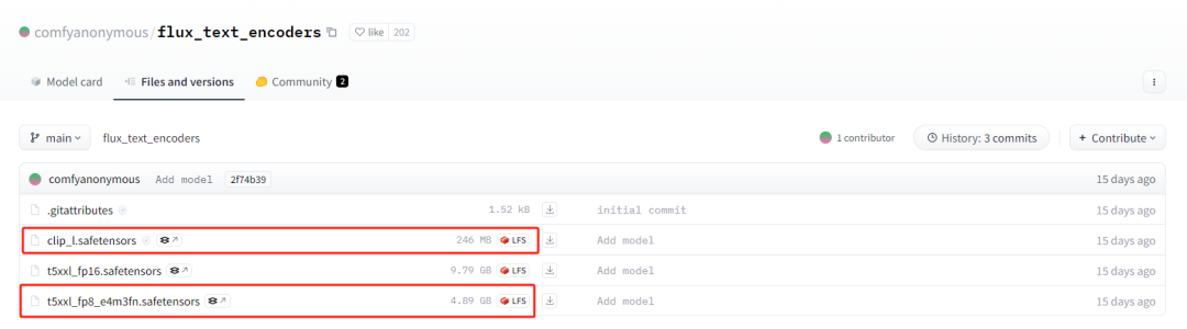下载t5xxl_fp8_e4m3fn.safetensors(4.89 GB)和clip_l.safetensors(246 MB)文件放置到\ComfyUI\models\clip目次下。
