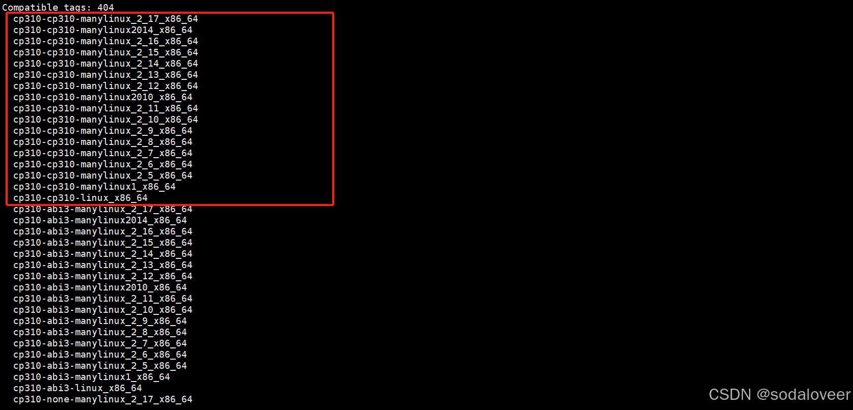 1、根据上面部分的Compatible tags支持版本,重新在下载网站中检索,下载包罗第一条的版本即可:cp310-cp310-manylinux_2_17_x86_64。