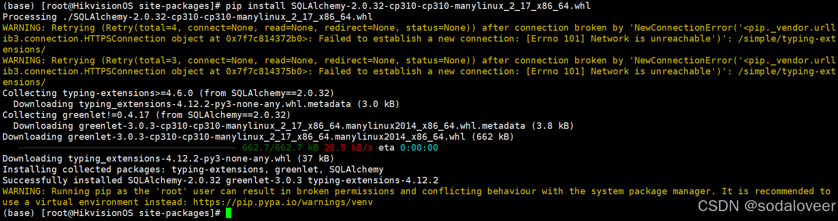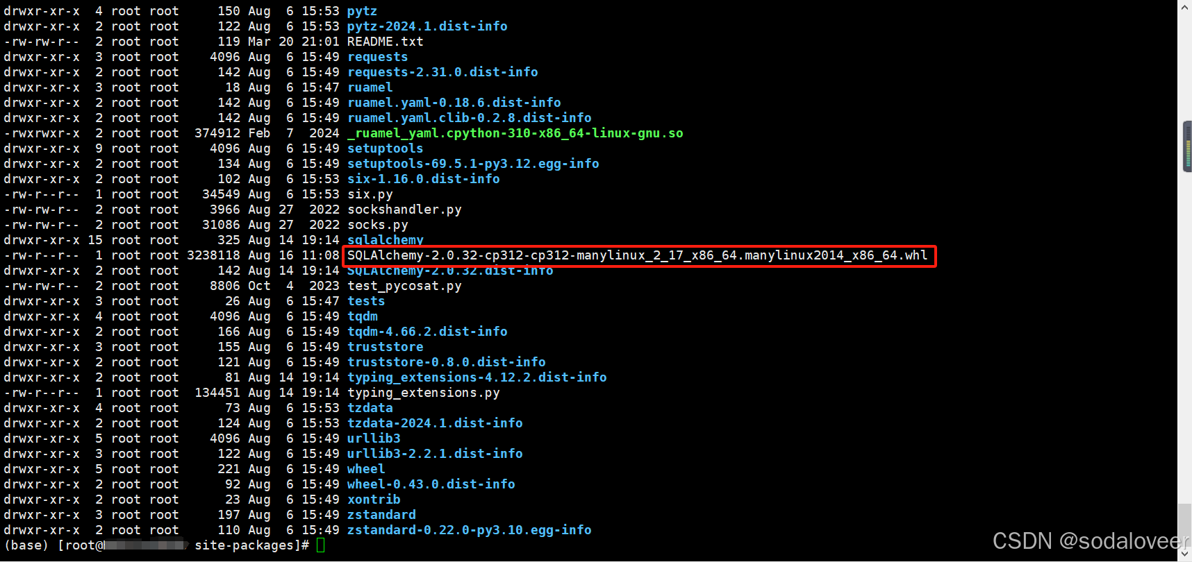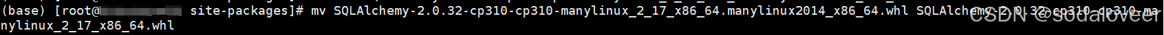 2、实行下令“mv SQLAlchemy-2.0.32-cp310-cp310-manylinux_2_17_x86_64.manylinux2014_x86_64.whl SQLAlchemy-2.0.32-cp310-cp310-manylinux_2_17_x86_64.whl” 将文件名从 “SQLAlchemy-2.0.32-cp310-cp310-manylinux_2_17_x86_64.manylinux2014_x86_64.whl” 改成 “SQLAlchemy-2.0.32-cp310-cp310-manylinux_2_17_x86_64.whl”,由于要和支持版本的名称一致。