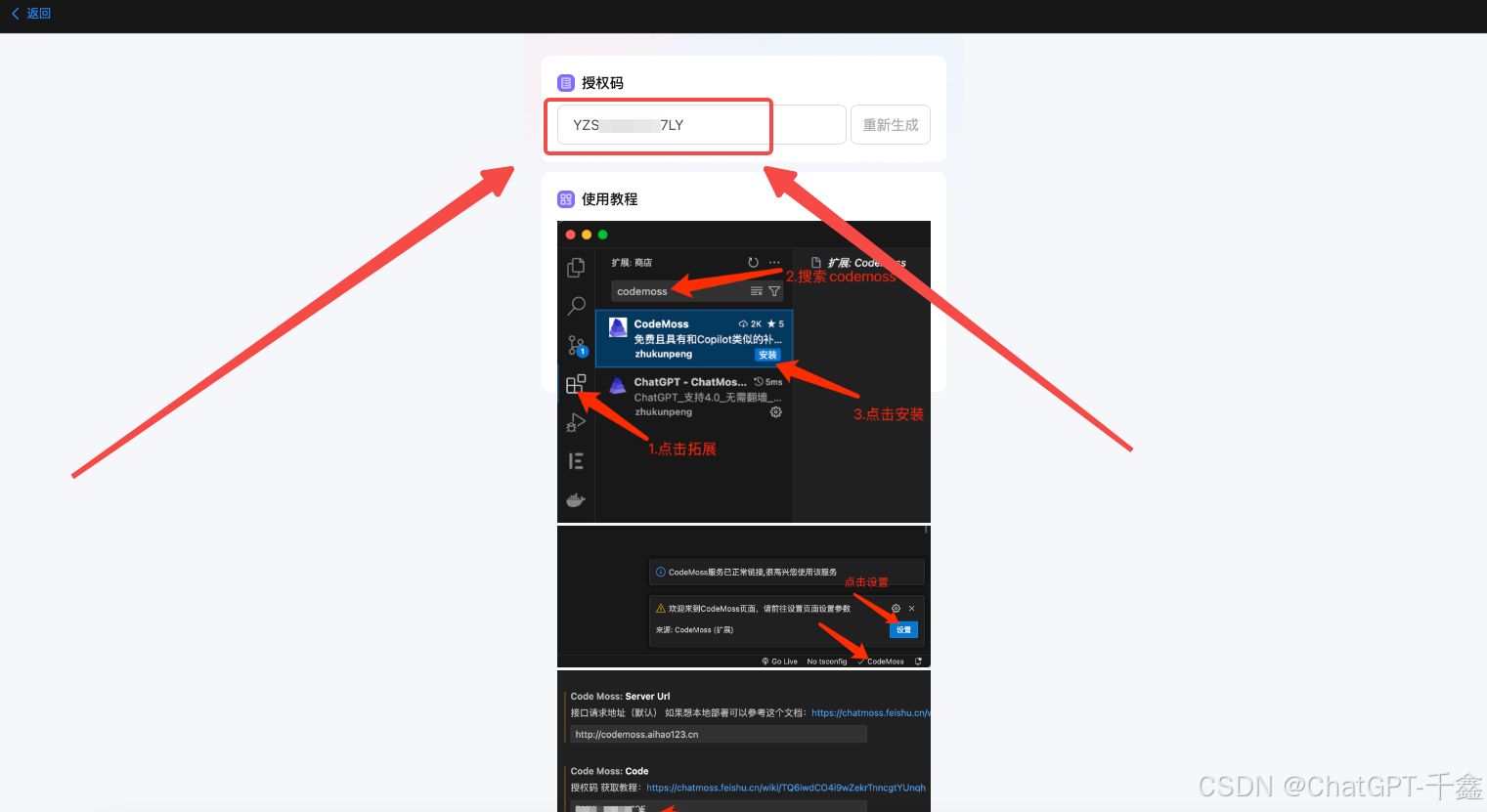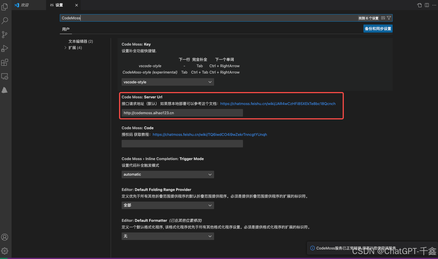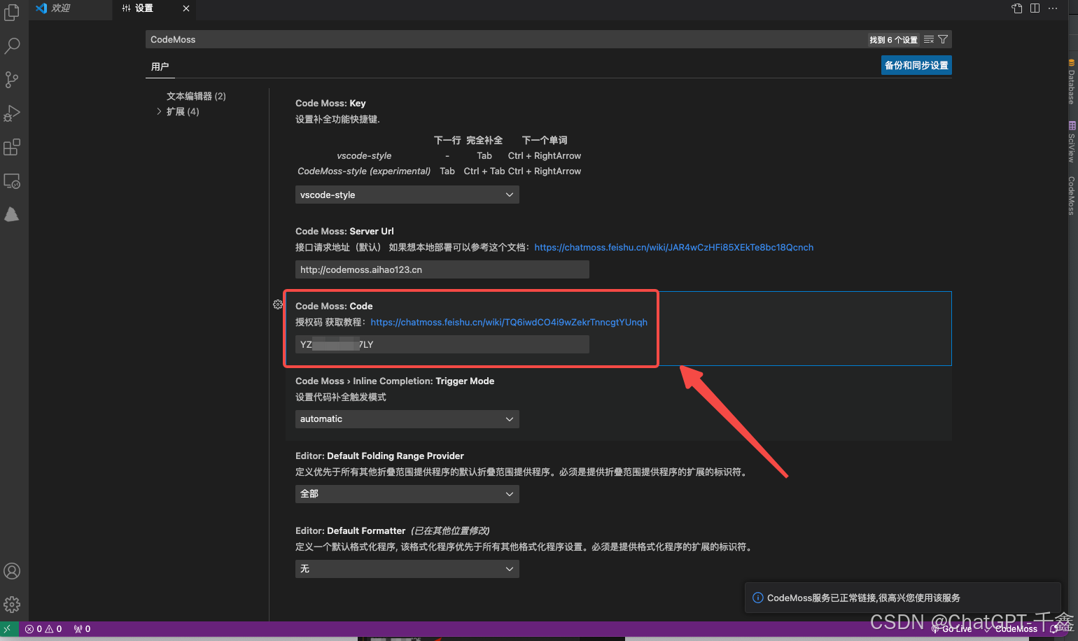 回到VSCode的CodeMoss设置页面,将复制的授权码粘贴到Code Moss: Code字段中。