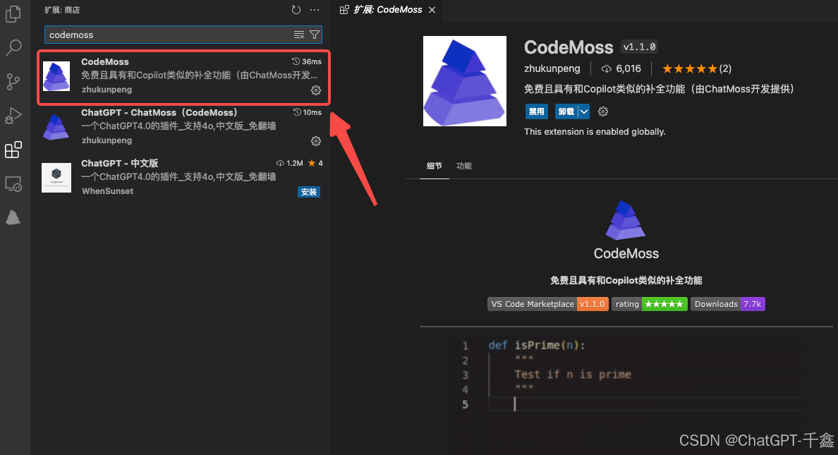 在搜索框中输入“CodeMoss”,您会看到多个相关插件。请注意,这里有两个名为CodeMoss的插件,都必要安装。