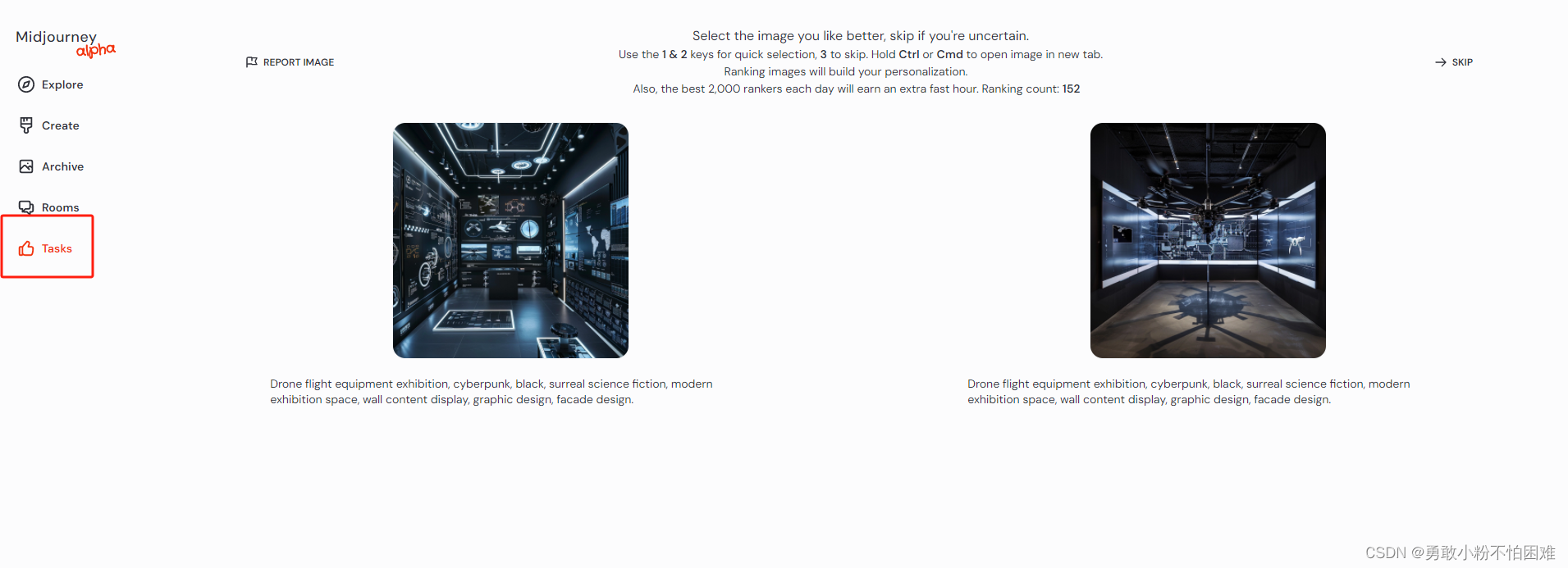 1.点击 https://www.midjourney.com/rank 对图片进行排名。不确定哪个更符合你的审美,可以跳过。这一步就是在确认你的个性化审美偏好。官方发起至少评价100组,理论上选得越多,midjourney越能理解你的偏好。