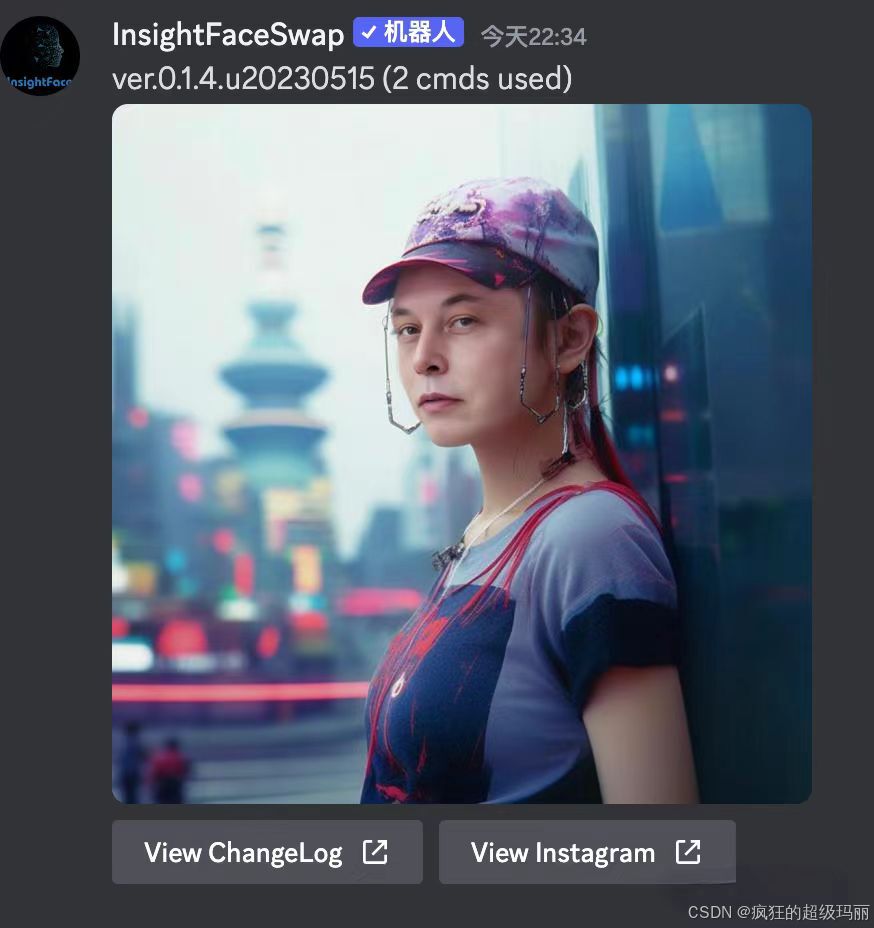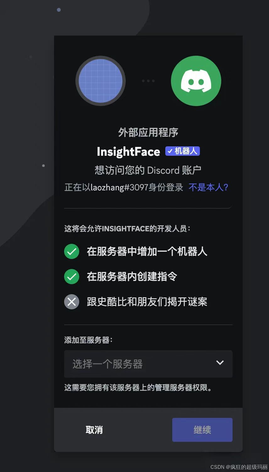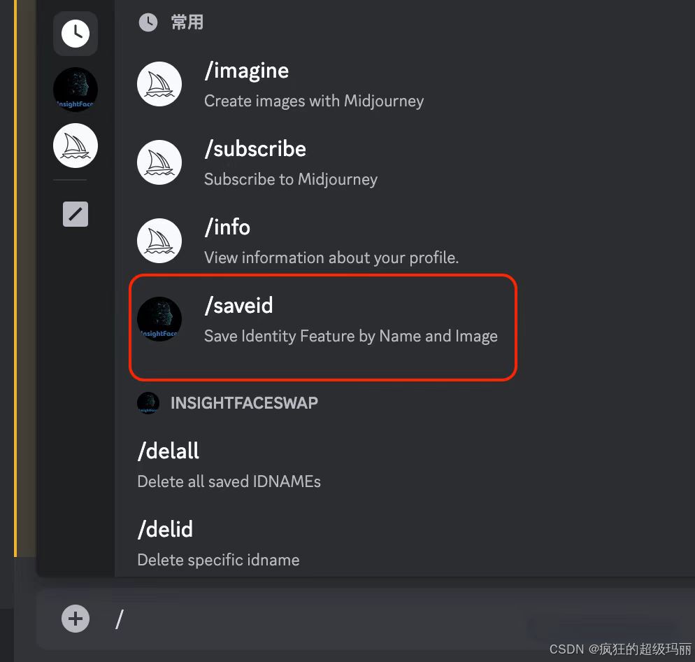 这个插件叫InsightFaceSwap ,大家可以通过一个邀请链接添加到自己的mj服务器上去。具体的邀请链接发在会员群里面(必要可以找coder_v5拿,务必备注来意)。点击这个链接之后,选择添加这个机器人到你的服务器即可。