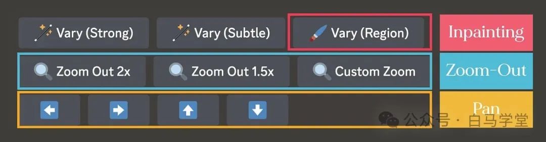 - Vary Region(Inpainting):选定并重新生成图片的特定部门,包括利用编辑器删除、修改这些被标注出来的部门。