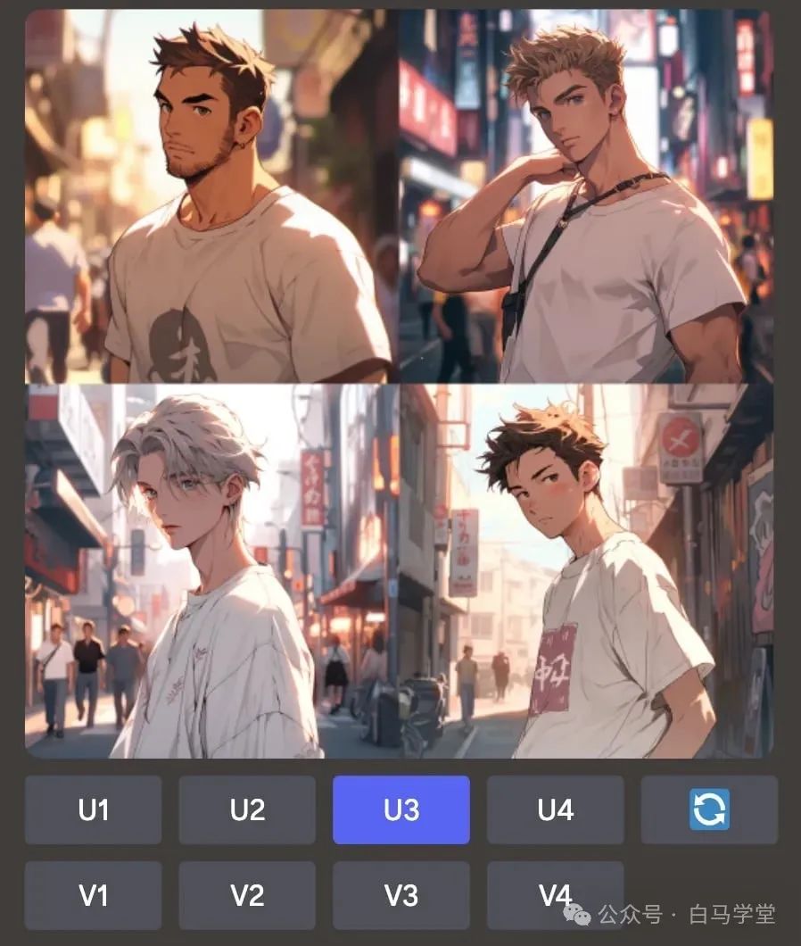 跟往常一样,首先利用/imagine 来生成图像,然后利用 U 按钮来放大图像: