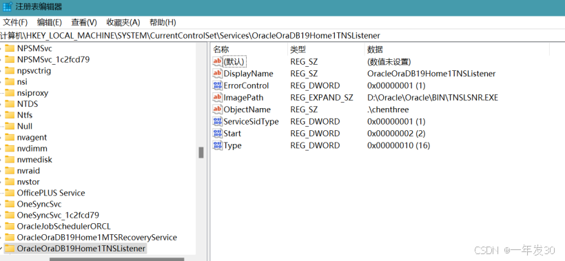 第一步:在搜刮栏搜刮“注册表编辑器”,打开后可以直接搜刮:计算机\HKEY_LOCAL_MACHINE\SYSTEM\CurrentControlSet\Services\OracleOraDB19Home1TNSListener