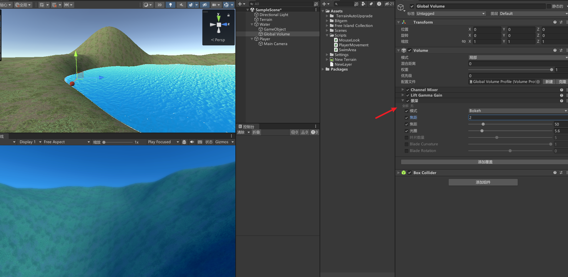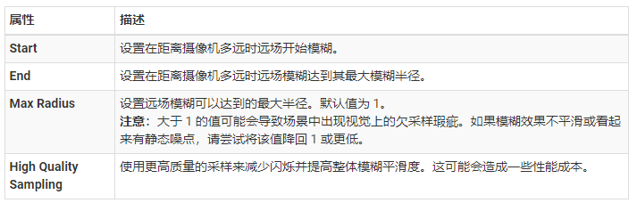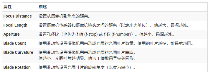 景深 (Depth Of Field) 组件将应用景深效果,可模拟摄像机镜头的焦点属性。在现实生活中,摄像机只能在特定距离的对象上清晰聚焦。距离摄像机更近或更远的对象会失焦。这种含糊效果提供了关于对象距离的视觉提示,并引入了“散景”,这是一种视觉瑕疵,出如今图像失焦的明亮地区周围