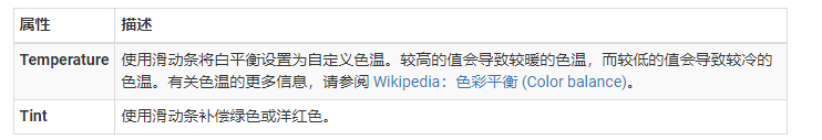 White Balance 组件应用白平衡效果来消除不真实的偏色,从而使现实生活中表现为白色的对象在最终图像中渲染为白色。还可以使用白平衡在最终渲染中创建团体更冷淡或更温暖的感觉。