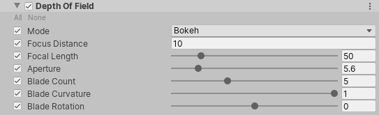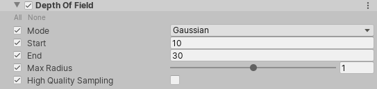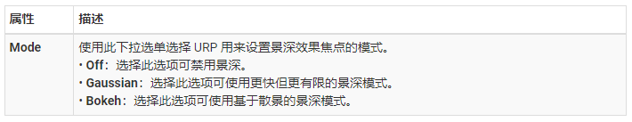 注意:对于景深,Unity 建议您对低端设备使用高斯景深 (Gaussian Depth of Field)。对于游戏主机和桌面平台,请使用散景景深 (Bokeh Depth of Field)。