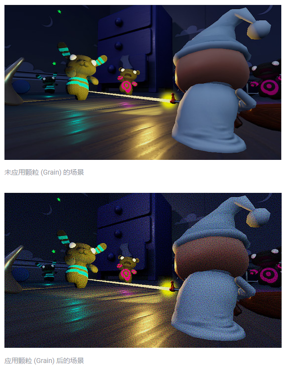 Unity 中提供的颗粒效果基于干系梯度噪点。此效果的常见用途包括模仿电影的明显缺陷;常用于可怕主题的游戏。