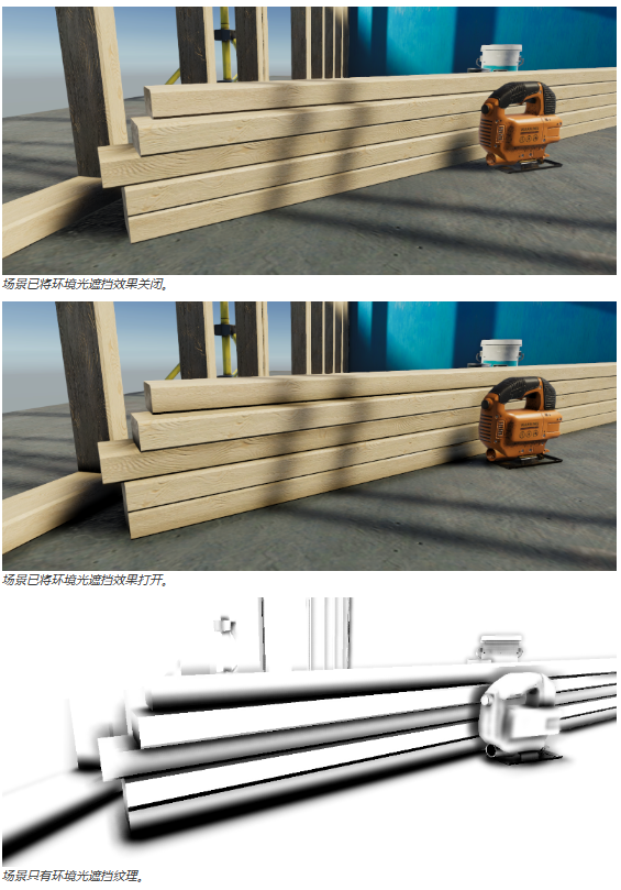 以下几个图表现的场景分别将情况光遮挡效果关闭、打开以及只有情况光遮挡纹理。