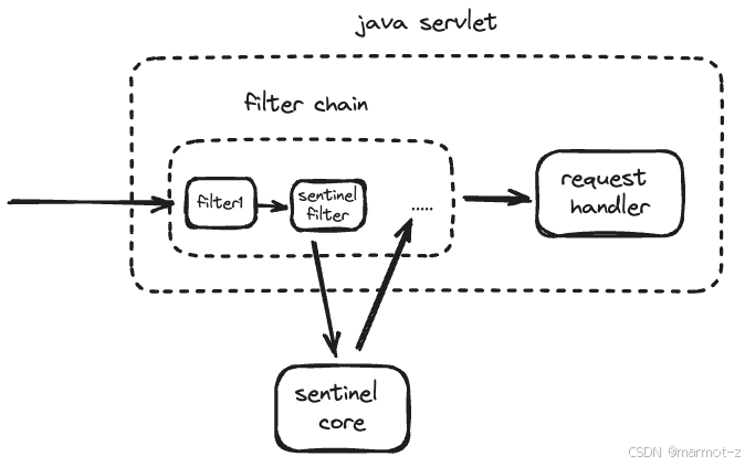 目前 sentinel adapter 模块支持集成 servlet、spring mvc、dubbo 等 20 种主流框架,对应实现的 adapter 实现原理根本相似。下面我们以 sentinel-web-servlet 为例,讲解 sentinel 怎样和 java servlet 举行集成,其大抵示意图如下: