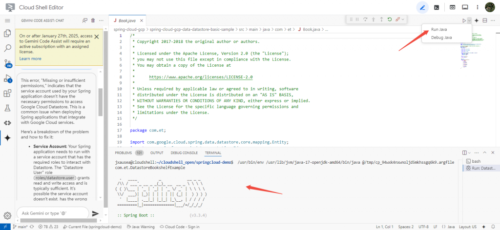 确保以上配置正确后,启动 Spring Boot 应用,利用 Postman 或 curl 调用程序。(因为网络原因,最好在cloud shell editor启动)