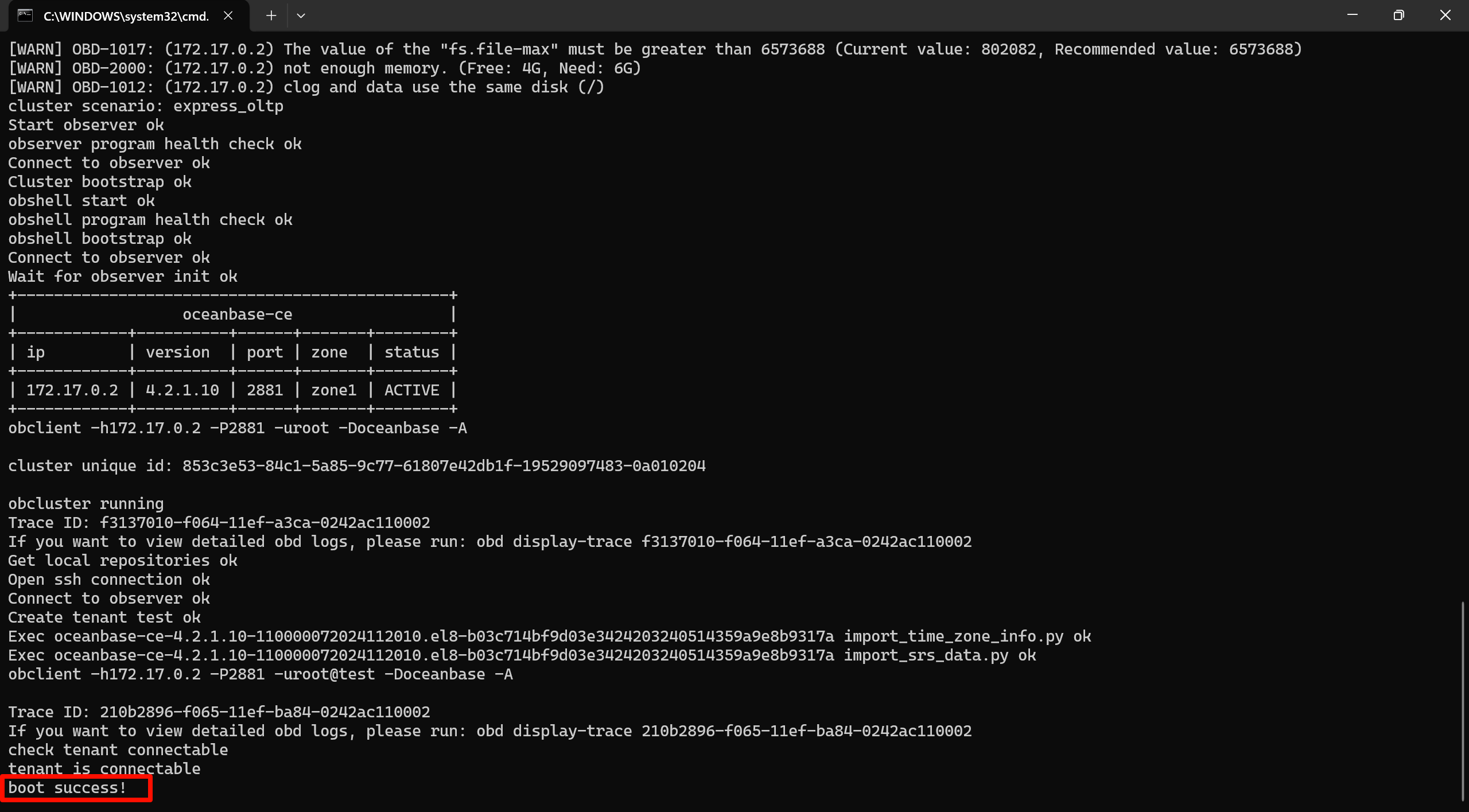 启动预计需要 2-3 分钟。执行以下下令,假如返回 boot success!,则启动成功。