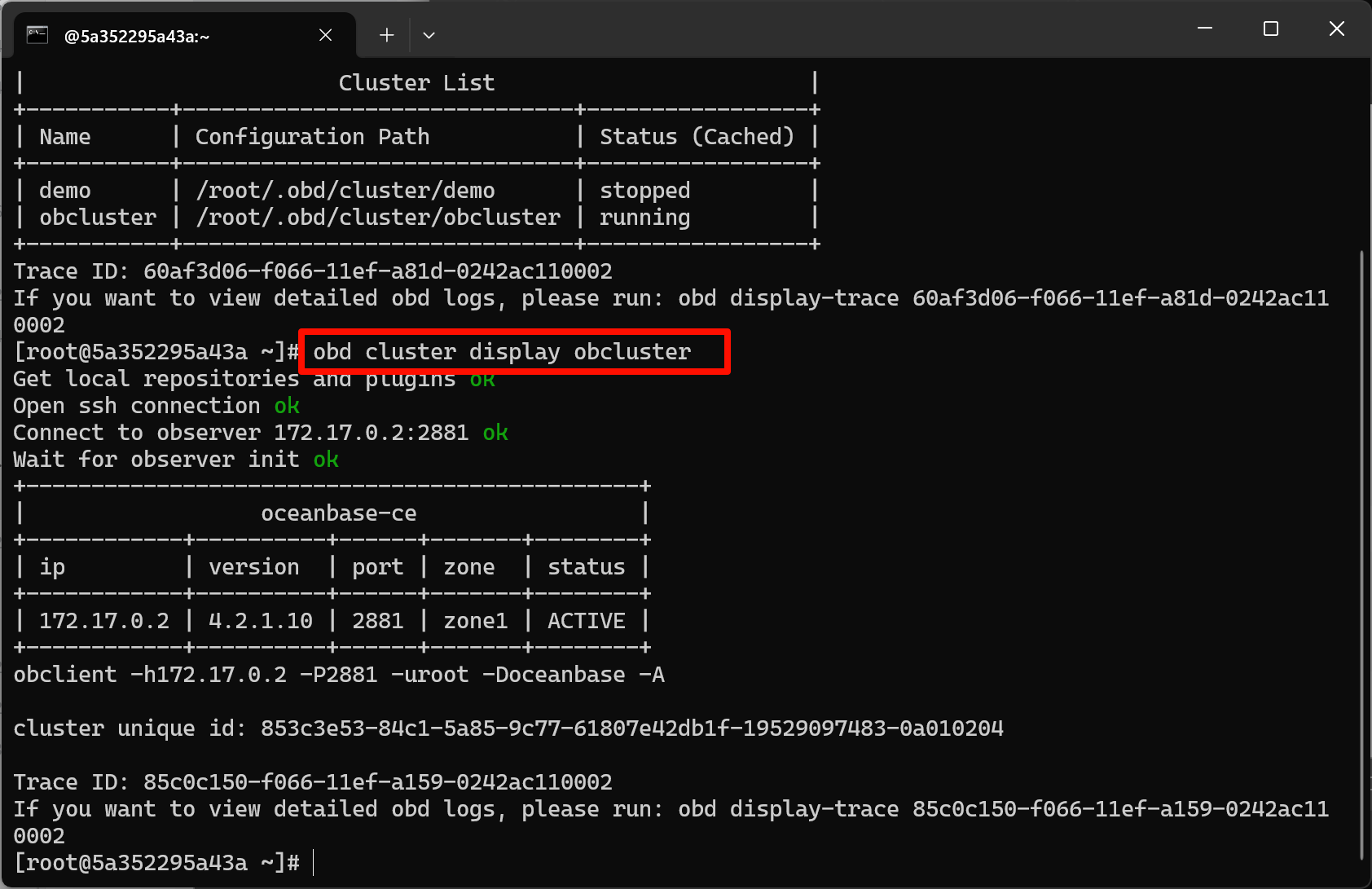 - | obcluster | /root/.obd/cluster/obcluster | running |