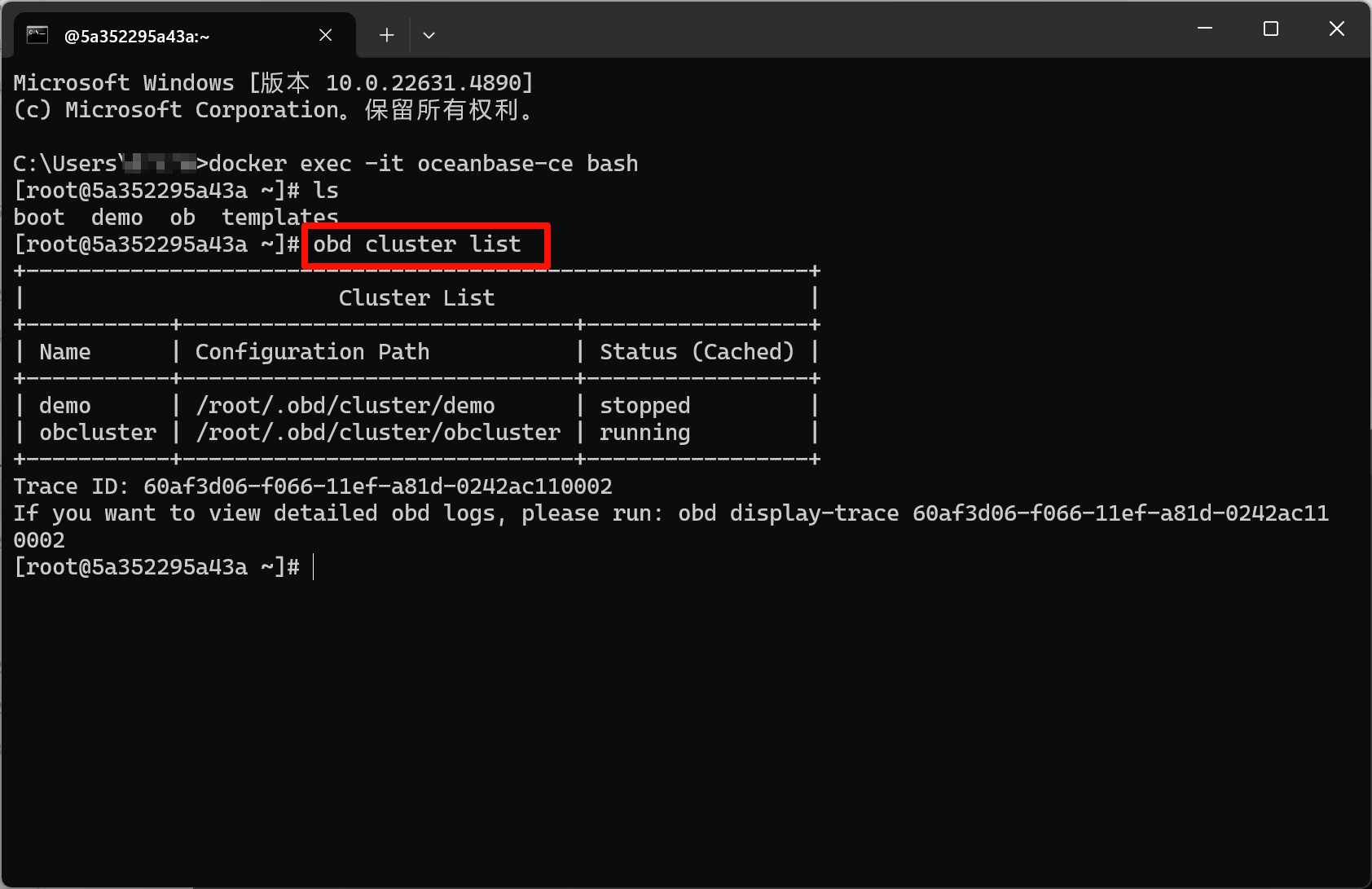 - [root@61d0ccd3ea95 /]# obd cluster list