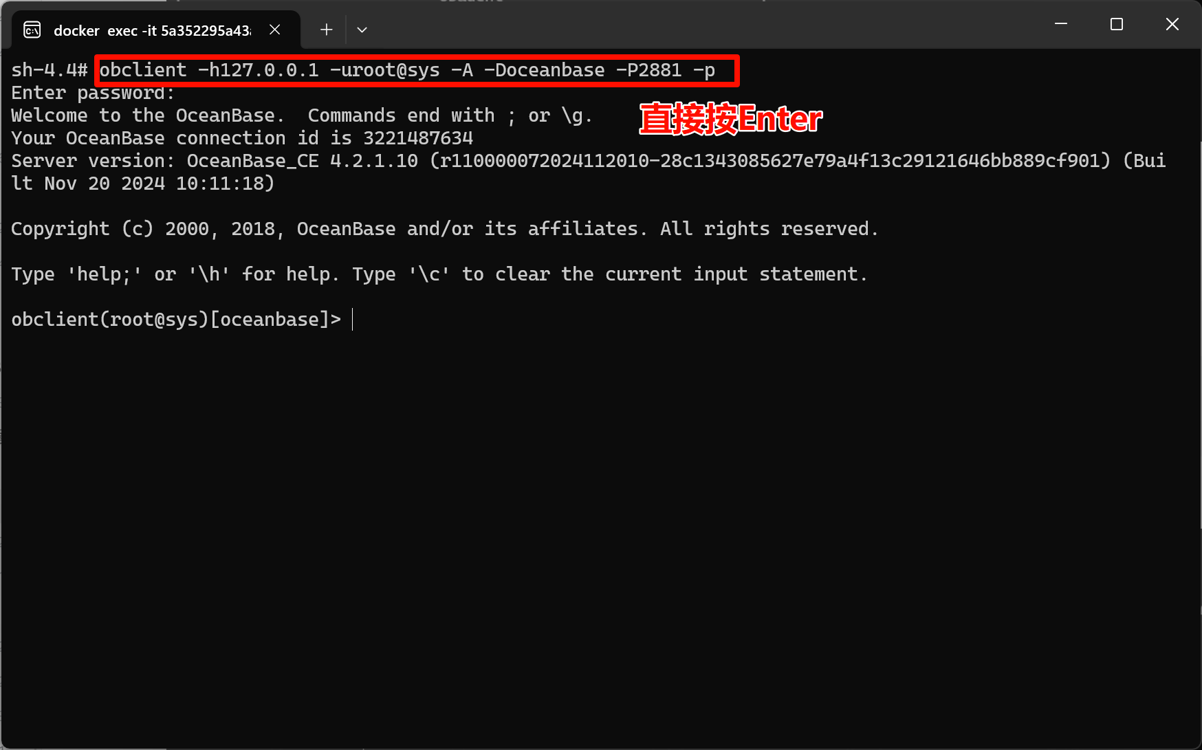 oceanbase-ce 镜像安装了 OBD(OceanBase Deployer,OceanBase 安装摆设工具)和 OBClient(OceanBase 下令行客户端)。您可选择进入容器,利用 OBD 下令管理和 OBClient 客户端连接实例,也可利用宿主机本地 OBClient 或 MySQL 客户端连接到 OceanBase 数据库实例。