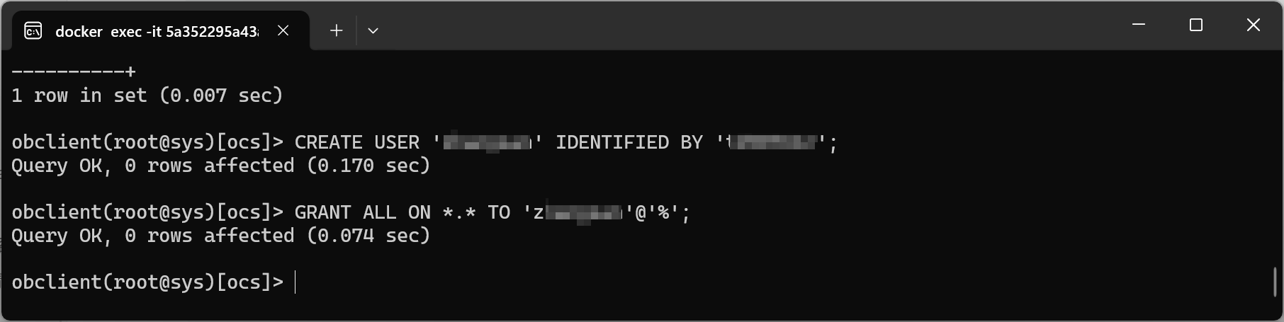 - 创建用户 :在源端业务租户下创建用户,用于数据迁移或数据同步。对于 OceanBase 数据库 MySQL 租户,利用以下下令: