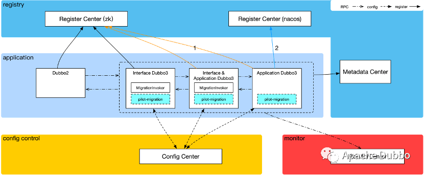 方案的设计重点放在"平滑、可控"两点,根据dubbo3的新架构,目前正在验证中的迁移方案示意图如下: