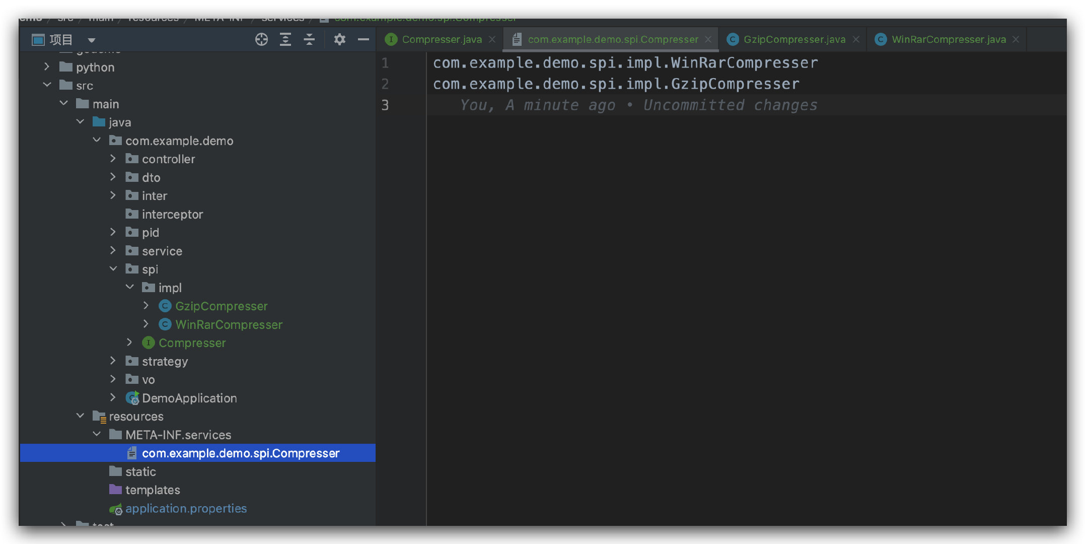 文件,我们接着在 resources 目录下创建一个名为 META-INF/services 的文件夹,在其中创建一个名为 com.example.demo.spi.Compresser 的文件,其中的内容如下:
