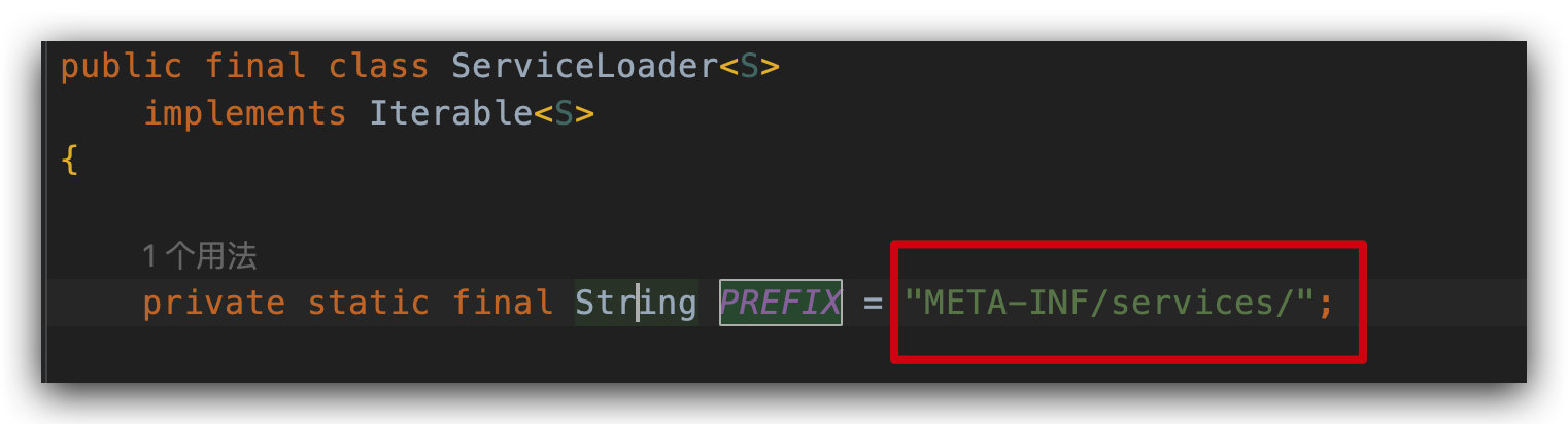点开 ServiceLoader 我们可以看到有一个常量 PREFIX,如下所示,这也是为什么我们必须在这个路径下面创建配置文件,因为 JDK 代码里面会从这个路径里面去读取我们的文件。