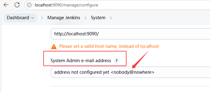 - 设置体系管理员的邮箱:Manage Jenkins->System->System Admin e-mail address