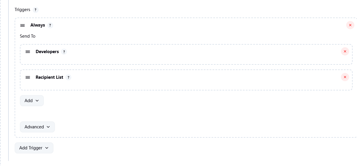 - Andvanced Settings->Triggers->Add Trigger(注意把构建失败才发送的默认设置给去掉再添加)