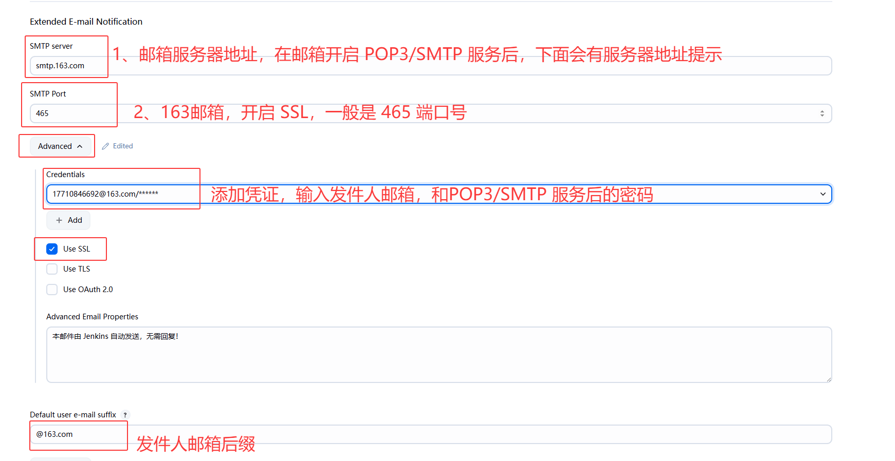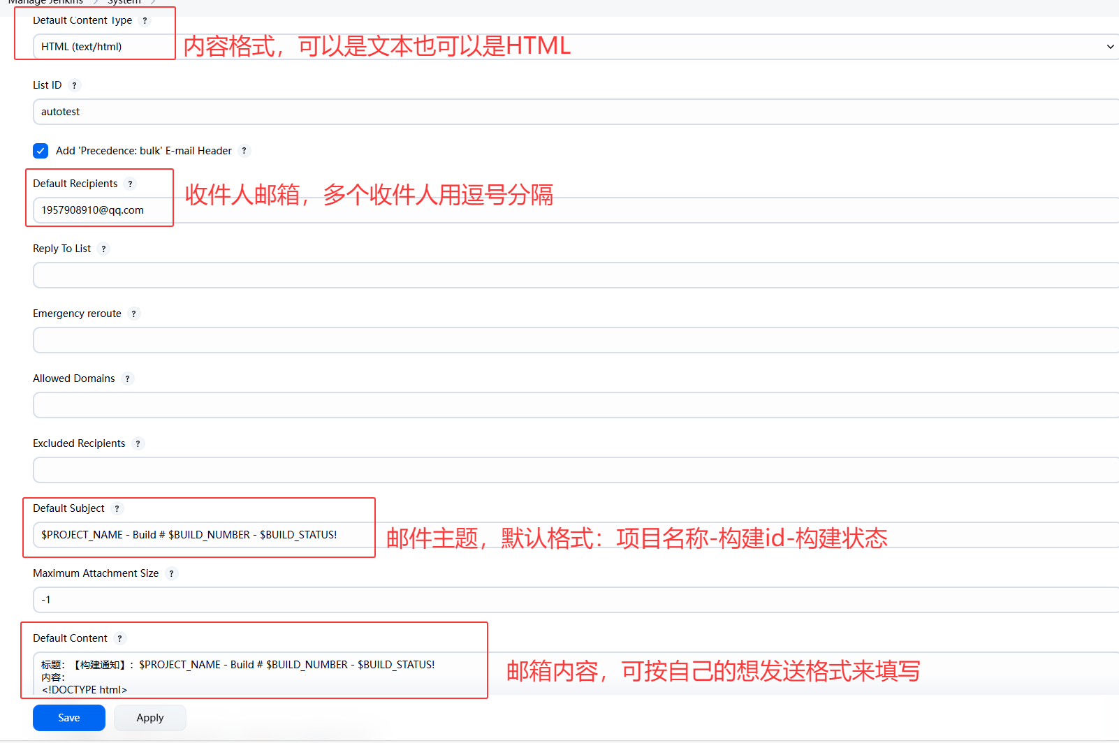 - 设置发件人信息:Manage Jenkins->System->Extended E-mail Notification