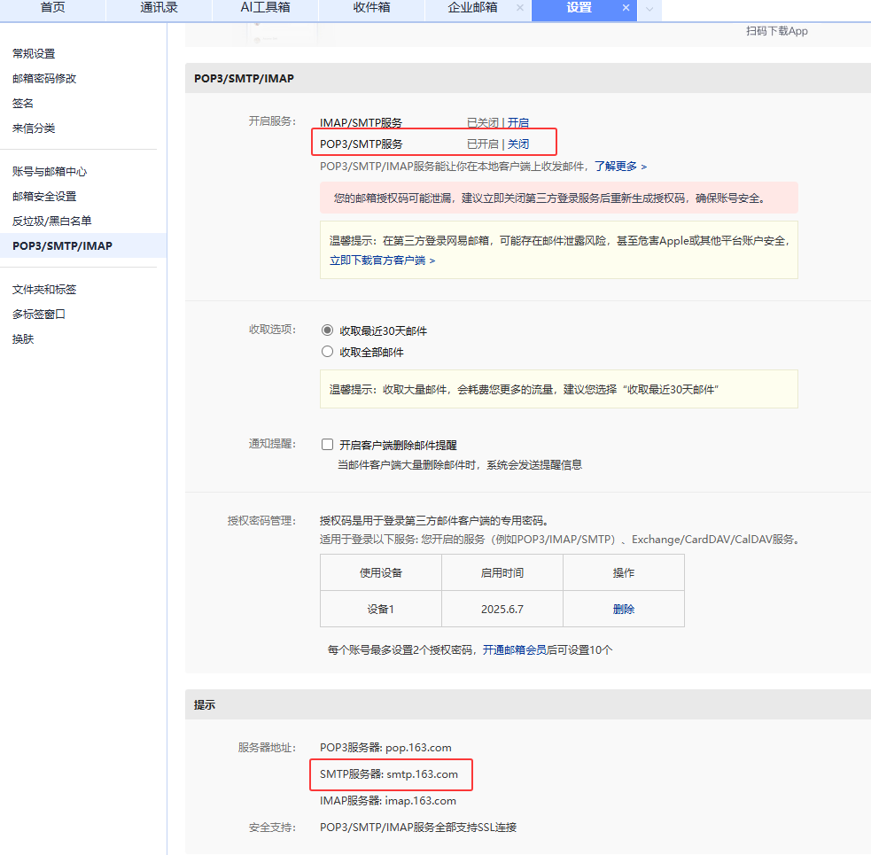 2)开启 POP3/SMTP 服务