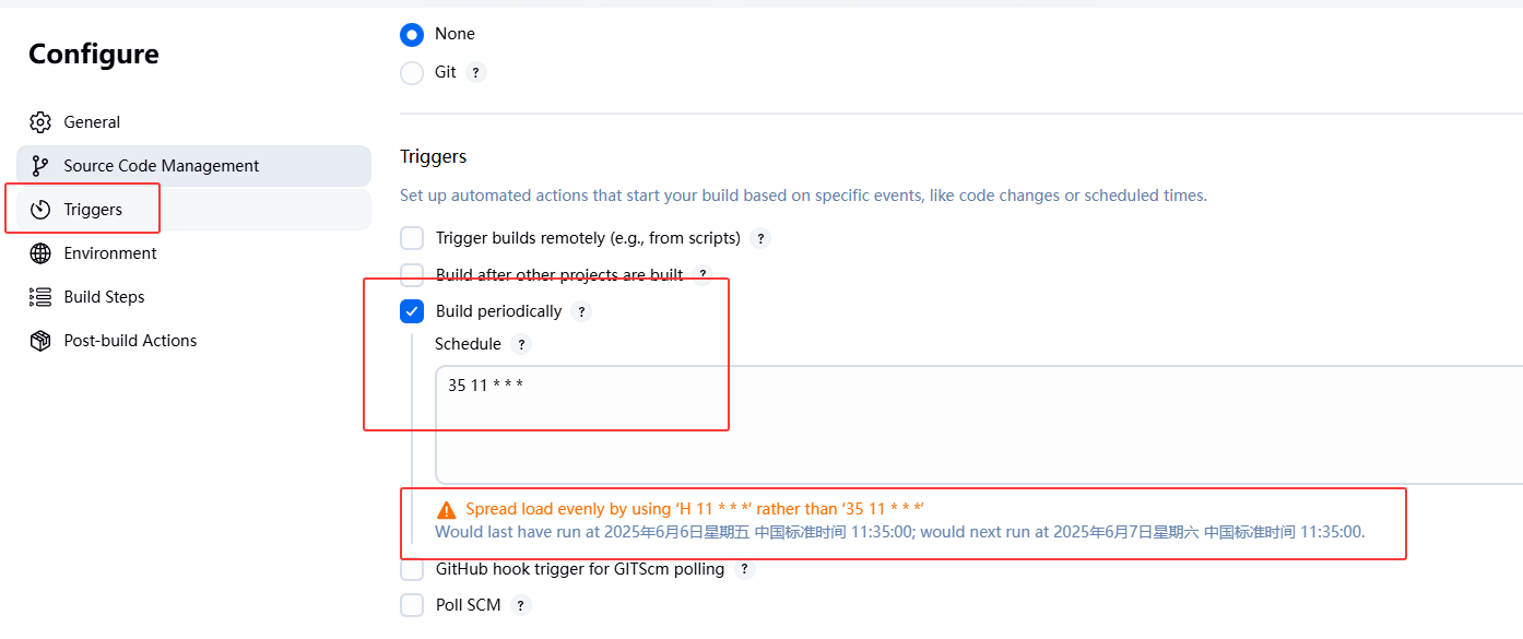- configure->Triggers->Build periodically