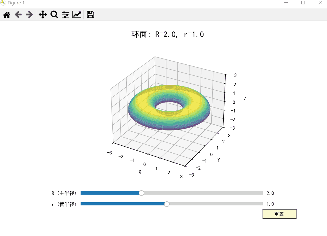 运行代码会弹出一个窗口,体现可交互的环面。通过拖动滑块可以调整环面的主半径®和管半径®,实时观察曲面外形的变化。点击"重置"按钮可以恢复初始参数。
