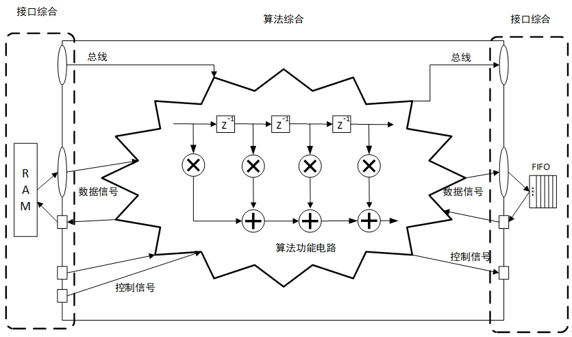 如图8.1.1所示,高层次综合器是一种能够将传统的高级语言描述的算法,转换为在可编程逻辑器件上实现的硬件描述语言的高效率开发工具。但一旦仔细推敲,细心的读者就会发现,传统的C/C++这类高级语言是建立在执行程序的CPU“逐条”取指执行的图灵机框架下的;而实现在可编程器件上的硬件电路却是相对固定,且需要实实在在接口硬件来完成算法数据的输入和结果输出的。因此高层次综合器的功能必然包括产生以下两部分电路:算法功能性电路,以及接口(也称为“顶层连接”)电路两个部分。图8.1.2所示的是一个典型的高层次综合器完成的硬件设计,其中包含了算法综合(Algorithm Synthesis)产生的功能性电路,以及接口综合(Interface Synthesis)产生的输入输出电路。而这两部分也是设计者使用高层次综合器开发时,需要根据要求着重设计和斟酌的。