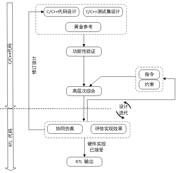 1)开发者需要给高层次综合器的,首先是一个能够实现所需算法功能的C/C++函数;其次是一个用于测试和验证该函数的标准输入和输出数据和调用该函数的代码。也就是上图中的“黄金参考”和“C测试集”(在很多设计中黄金参考被以数据的形式写入到C测试集的C/C++代码中)。