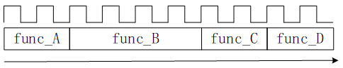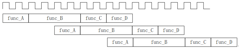 其二,在数据依赖关系允许的条件下,调整被绑定硬件资源的工作时序,最大程度的提高各个模块的并行度。使完成不同功能的硬件资源像“流水线”上的工人一样有序的持续工作,轮流对被处理的数据流中的具体数据分别进行“加工处理”,从而改善数据吞吐量。同样以上面的C语言伪代码为例,不考虑图8.1.10所示的延迟优化(四个函数顺序执行)。其中func_A、func_B、func_C和func_D相当于流水线中完成特定功能的“工人”,而不断进入的数据则相当于需要加工的“工件”。假设func_A、func_B、func_C和func_D所需的延迟分别为2、4、2、2个时钟周期,则可通过调度将重复执行的数据通路并行化,如图8.1.11所示。每个数据通路并行化后的延迟,为四个函数中执行时间最长的4个时钟周期。这样当大量数据依次通过数据通路后,电路的整体延迟虽然仍为10个时钟周期,但吞吐量缩减为3个时钟周期。