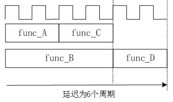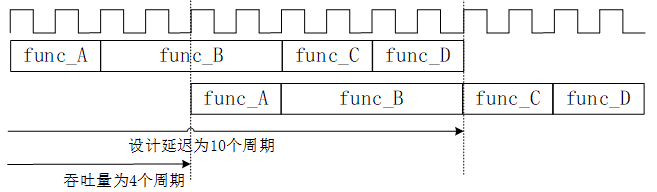 阅读至此读者一定充满了疑惑,既然设计延迟和设计吞吐量含义相同,为什么要用两个不同名字?其实我们图8.1.4中在讨论“吞吐量”的含义时,并未考虑电路“并发”的情况——硬件电路和高级语言实现算法不一样,可编程器件上不同部分的硬件电路可以同时执行多步运算,不像CPU执行高级语言语句只能一次逐条执行。这样当可编程器件中的一部分电路执行图8.1.4的func_B时,原来执行func_A的电路就可以再次取一笔新的数据执行,从而提高整个电路的吞吐量。如图8.1.5所示,电路的吞吐量就提高为4个周期。